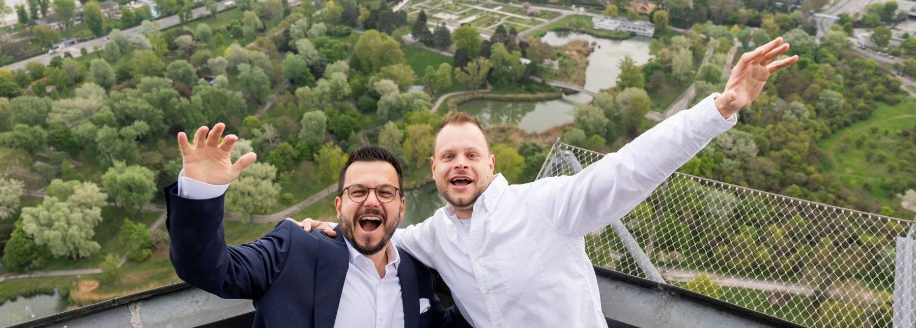 Roman Bauer, Geschäftsführer Donauturm und Johannes Lanzinger, Klinischer Psychologe und Leiter von Phobius mit Blick in die Tiefe