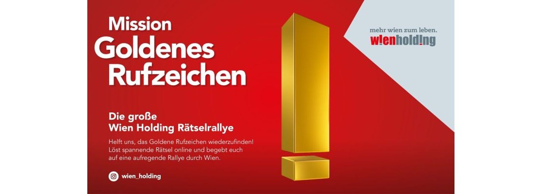 Das rote Rufzeichen ist ein unverkennbares Markenzeichen der Wien Holding. Doch es gibt ein ganz besonderes Rufzeichen in der Wien Holding – das Goldene Rufzeichen! Genau dieses ist verschwunden – spurlos! Nur wer die Hinweise aufmerksam verfolgt, kann das Rätsel lösen und das Goldene Rufzeichen wiederfinden.