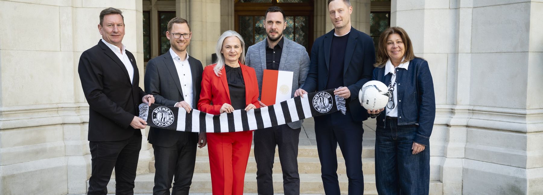v.l.n.r.: Wolfgang Raml (Wiener Sport-Club), Christoph Joklik & Sonja Zahradník-Leonhartsberger (Wien Holding Sport GmbH), MA 51 Abteilungsleiter-Stellvertreter Konstantin Drimzakas, David Krapf-Günther (Wiener Sport-Club), Gemeinderätin Yvonne Rychly